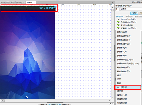 回到首页,选中动态面板“状态栏”,在“部件交互和注释”窗口中,点击“更多事件”,打开更多事件列表,点击“向下滑动时”,打开用例编辑器
